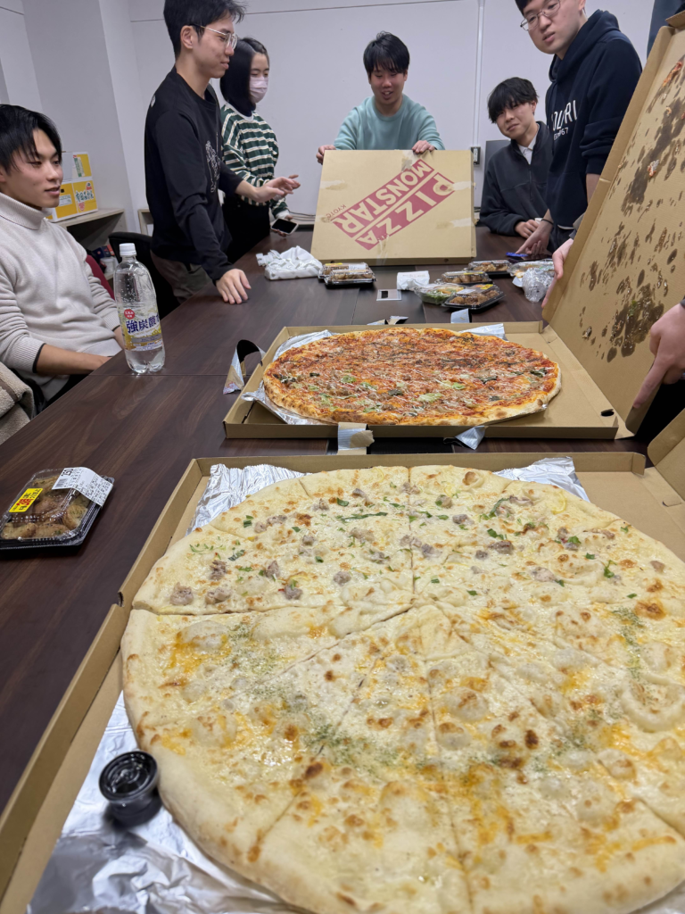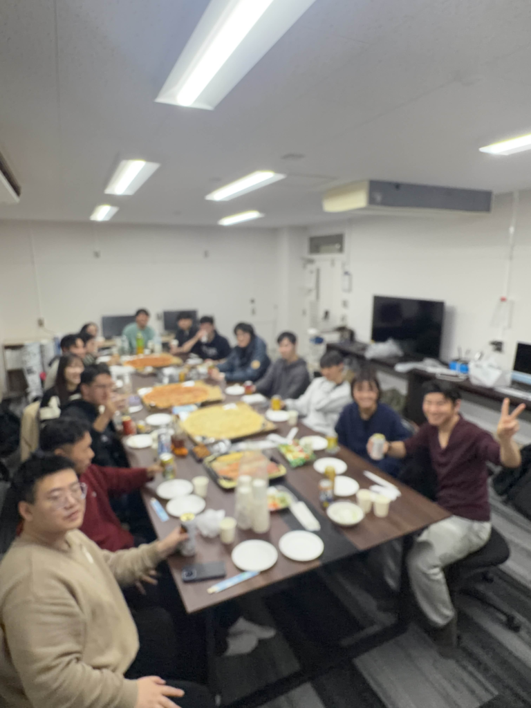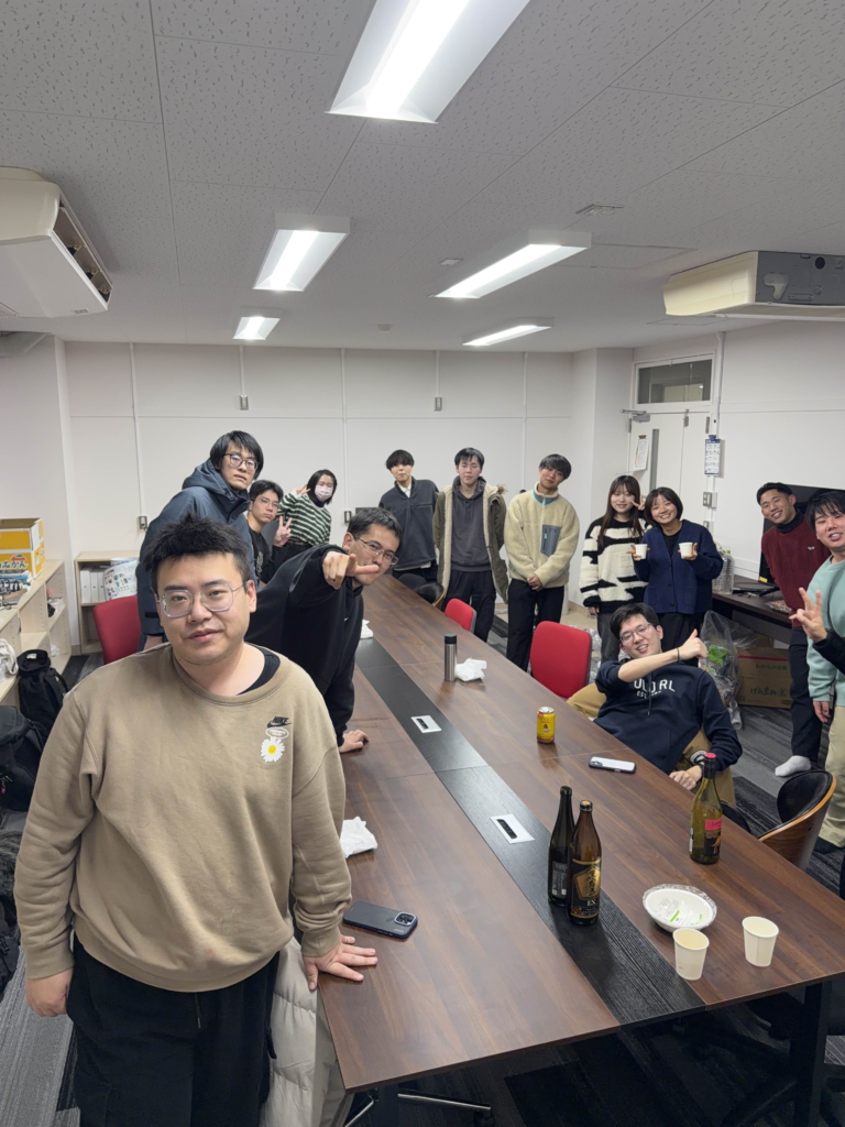 EntertainmentGeneralMembersNews 2026年研究室新年会 01/15/2026 高塚和夏 1月15日に、学生居室で新年会を開催しました。新しくアルバイト学生2名(B2辻横くん、B1船本くん)も加わり、研究の話題から日常の話まで学年を越えて和やかに交流する良い機会となりました。